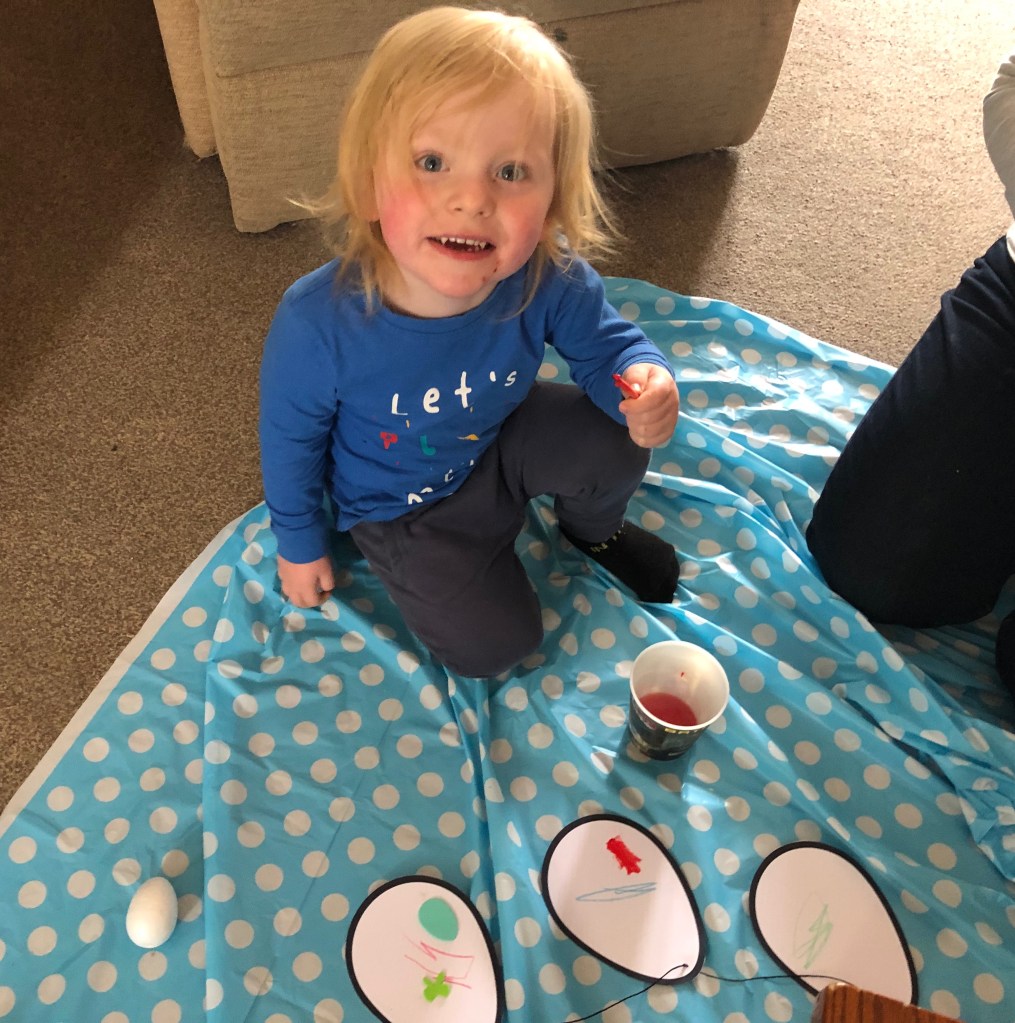 The next step is to make small holes at the top of each Easter egg and carefully thread string through each hole to transform it in to a banner. All of this so far was done whilst Robbie had his nap, we’re not silly, but now we needed our artist.